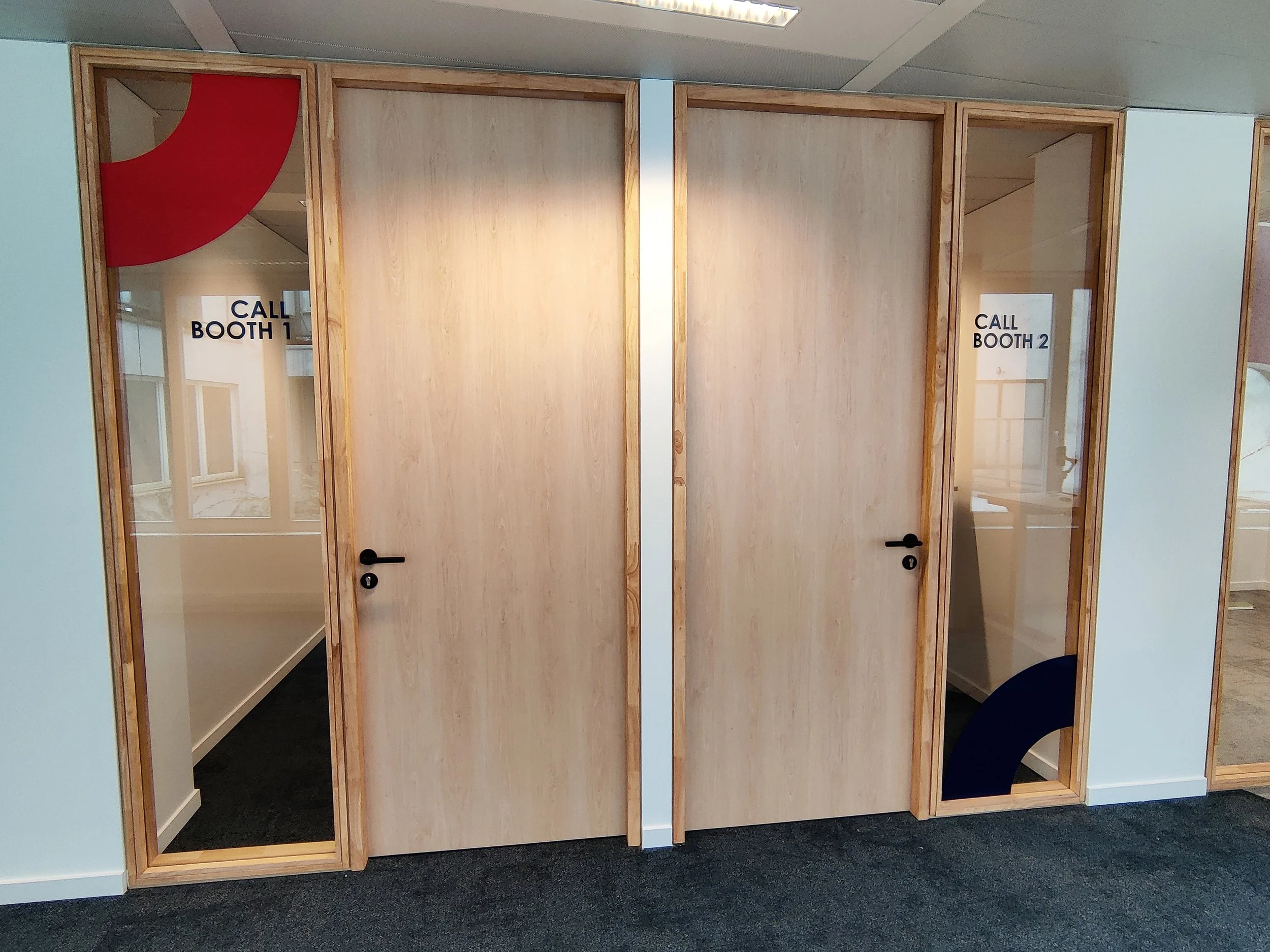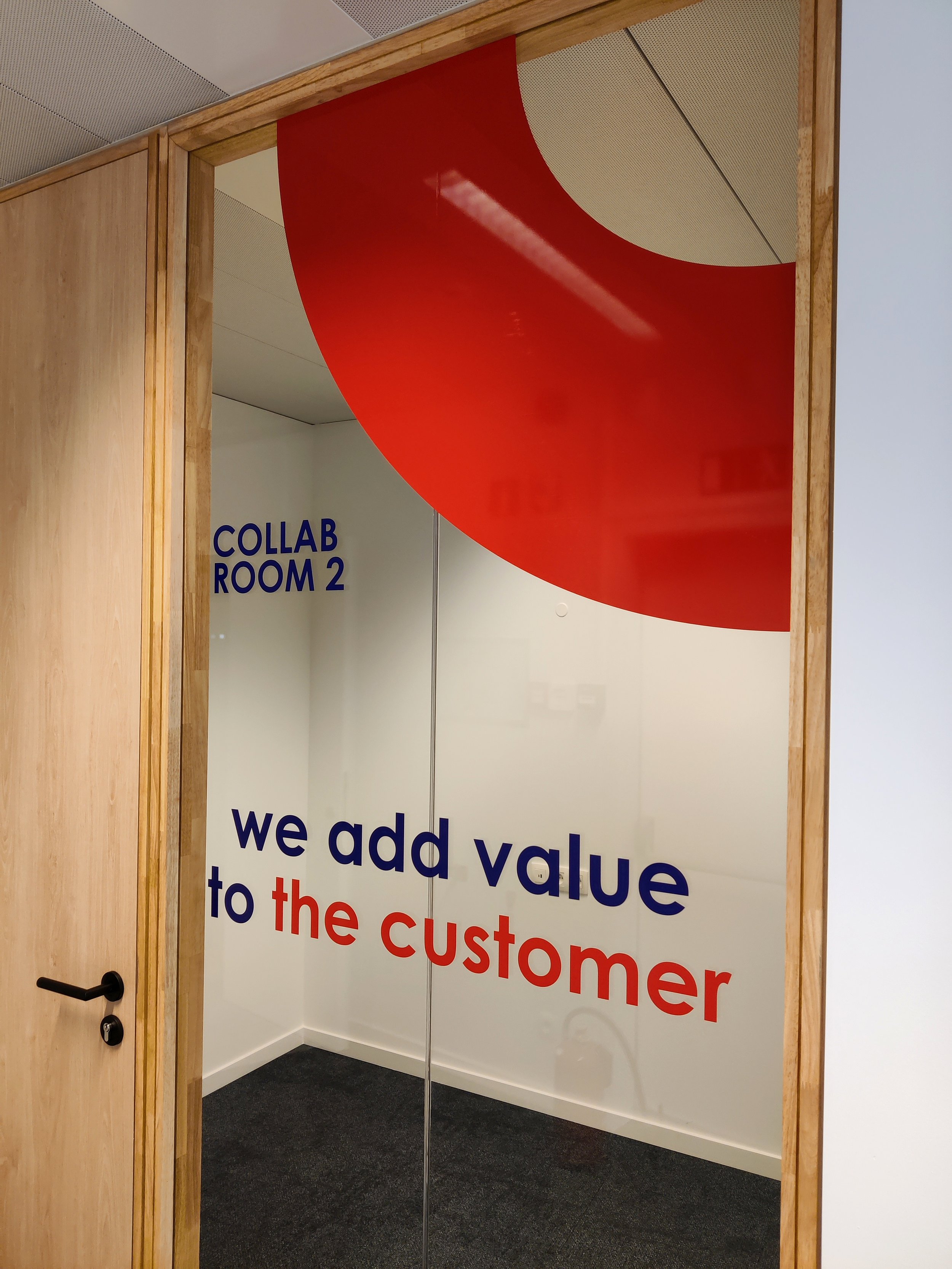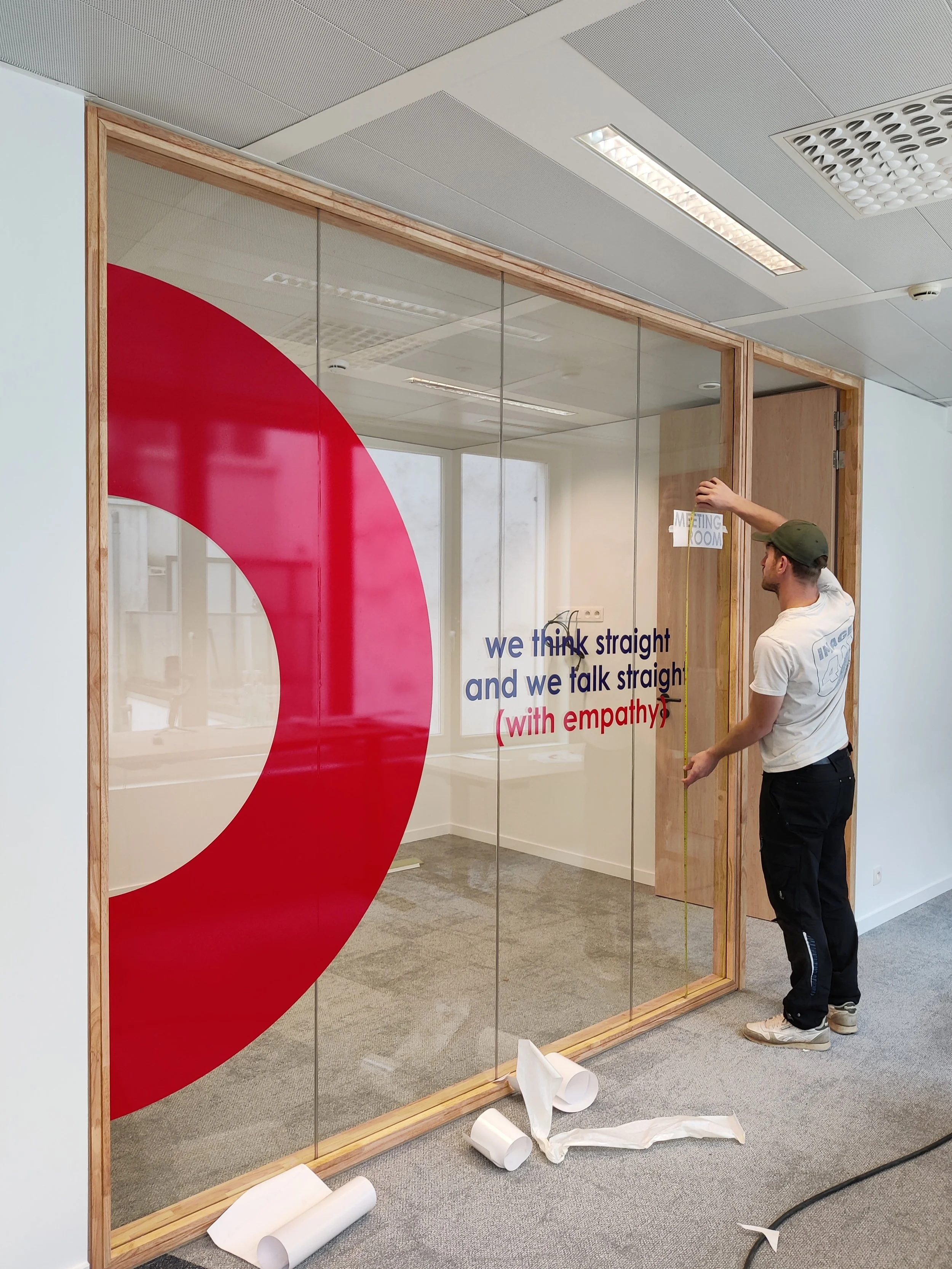 Het project vereiste de combinatie van diverse, uiteenlopende elementen: muurstickers, folies op ramen en akoestische ophangelementen voor een aangename werkomgeving.