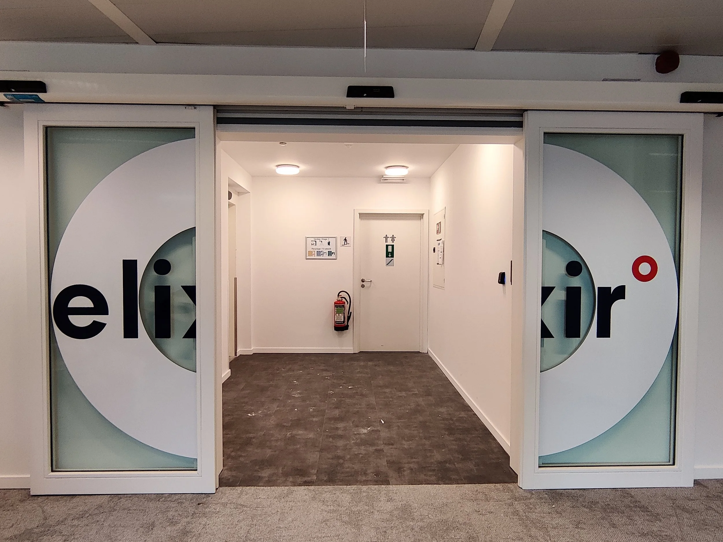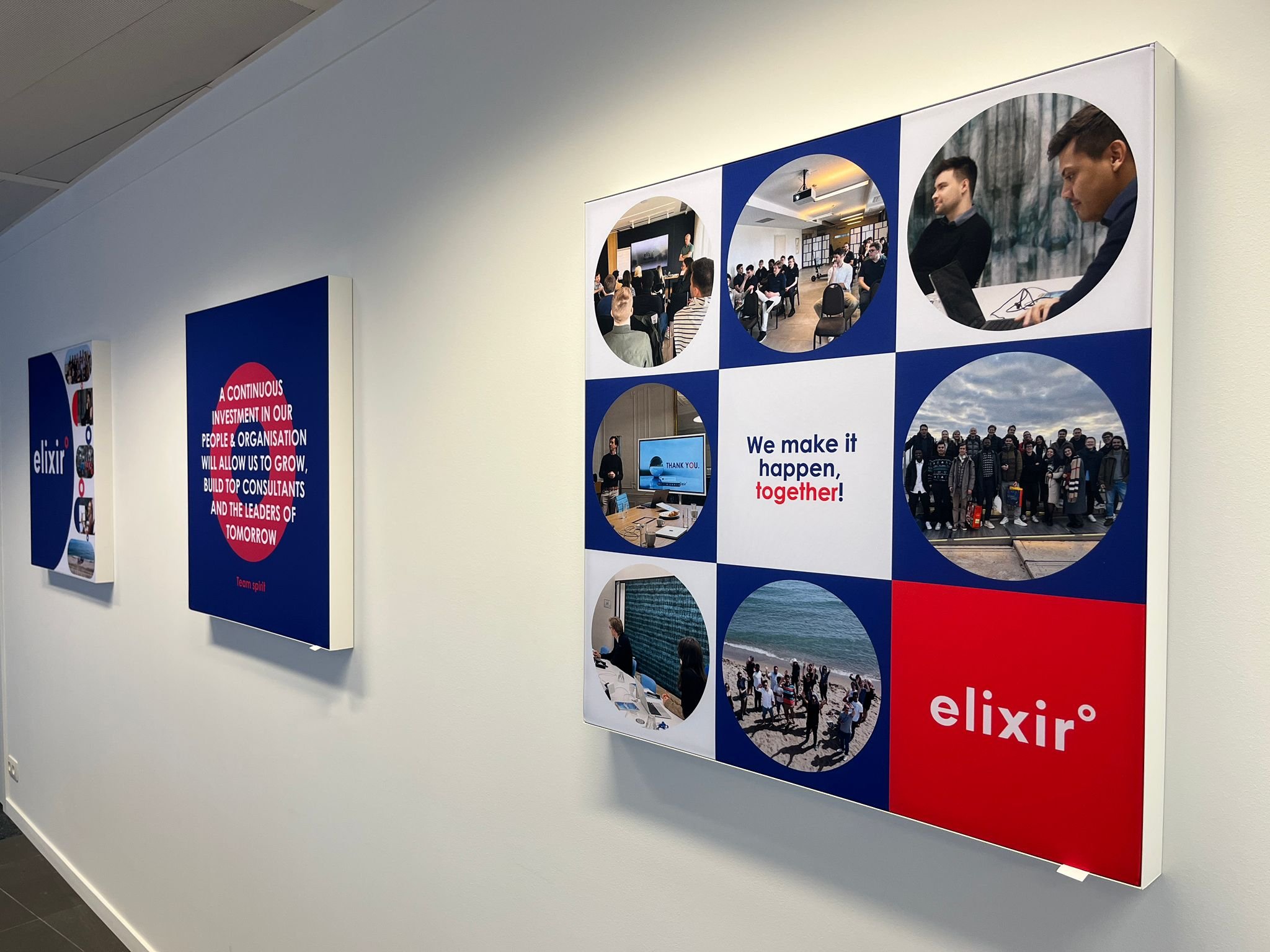 Maximaal Onderscheid in een Gedeeld Kantoorgebouw. Het nieuwe kantoor van Elixir nam een verdieping in een groot bedrijfsgebouw in het centrum van Brussel in beslag. De specifieke nood was om de identiteit van Elixir onmiddellijk te laten uitspringen in de gemeenschappelijke ruimtes en een duidelijke, eigen sfeer te creëren op hun etage.